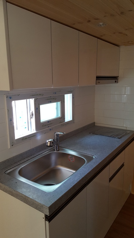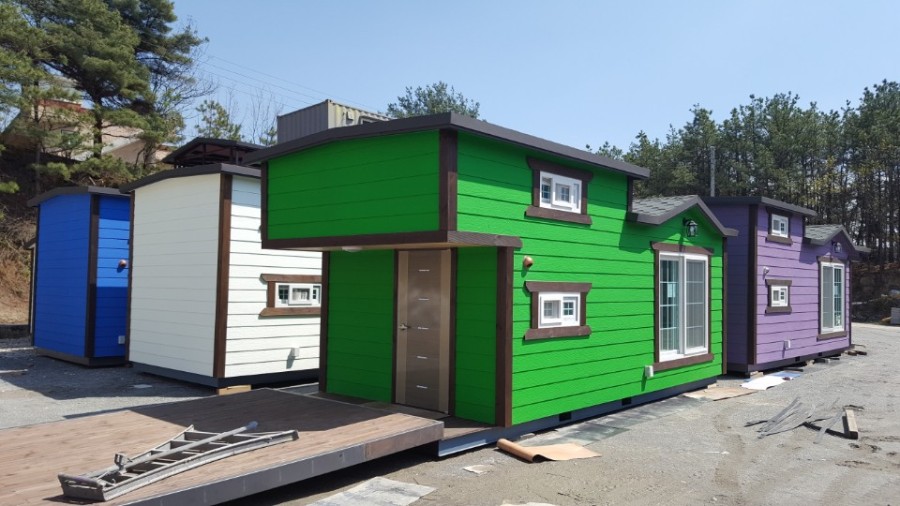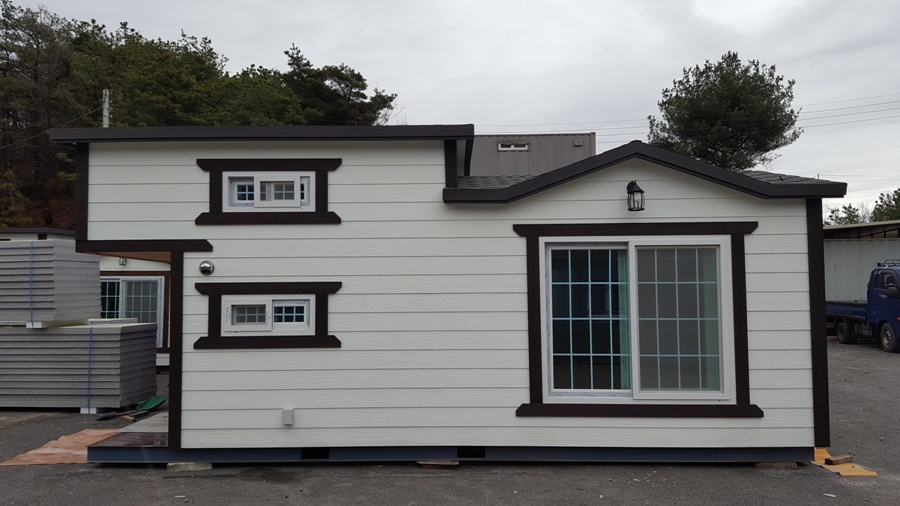 바닥베이스철골작업->각파이프사용 벽,지붕 철골작업->샌드위치판넬사용 벽,지붕 시공->다루끼 상 작업후 내부 스티로폼 전체1벌시공(이중단열)->전기배선(전등,전열,접지선 분리시공2.5sq) 및 내부전체 파인루바마감->외부시멘트사이딩마감(외부색상선택)->지붕 아스팔트슁글마감->18mm합판위 보온시트시공 전기판넬시공 모누륨 마감->전체 페어 이중창시공->코너방부목설치 기타 작업일체.(기타 바닥 온수보일러 및 구조변경 가능)->씽크대,상부장,전기레인지,후드->옵션(전면풀데크,옥상(계단포함),원두막,기타내부옵션(선택)
