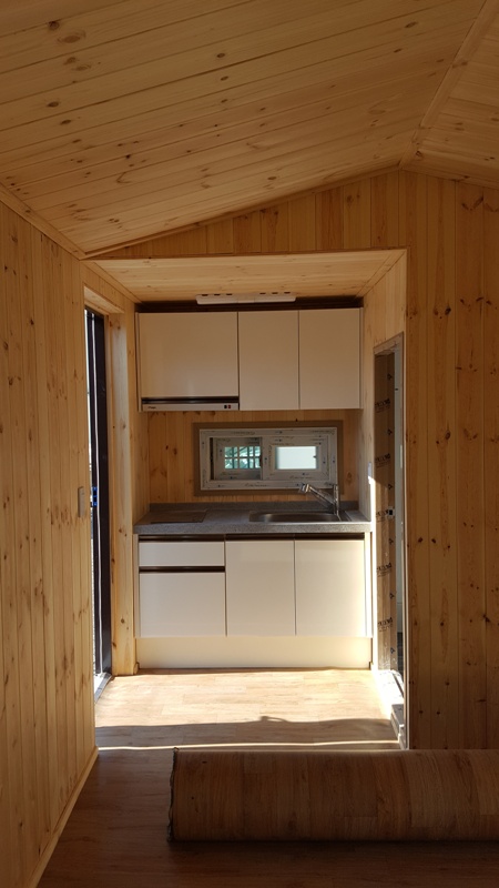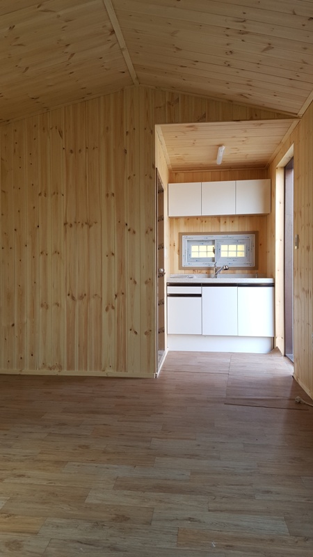 바닥베이스철골작업->각파이프사용 벽,지붕 철골작업->샌드위치판넬사용 벽,지붕 시공->다루끼 상 작업후 내부 스티로폼 전체1벌시공(이중단열)->전기배선(전등,전열,접지선 분리시공2.5sq) 및 내부전체 파인루바마감->외부시멘트사이딩마감(외부색상선택)->지붕 아스팔트슁글마감->18mm합판위 보온시트시공 전기판넬시공 모누륨 마감->전체 페어 이중창시공->코너방부목설치 기타 작업일체.(기타 바닥 온수보일러 및 구조변경 가능)->씽크대,상부장,전기레인지,후드->옵션(전면풀데크,옥상(계단포함),원두막,기타내부옵션(선택)
