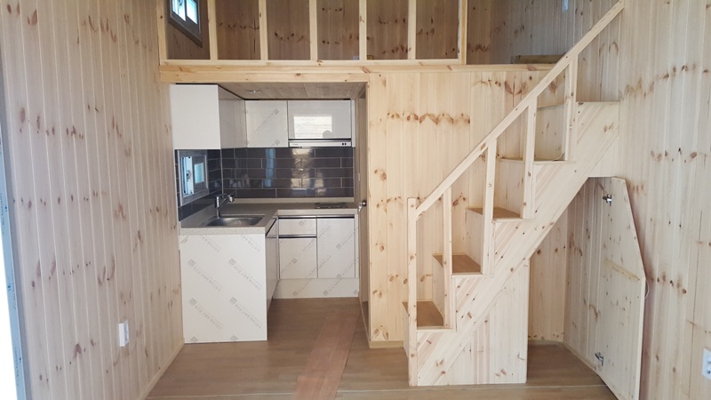바닥베이스철골작업->각파이프사용 벽,지붕 철골작업->샌드위치판넬사용 벽,지붕 시공->다루끼 상 작업후 내부 스티로폼 전체1벌시공(이중단열효과)->전기배선(전등,전열,접지선 분리시공2.5sq) 및 내부전체 파인루바마감->외부시멘트사이딩마감(외부색상선택)->지붕 아스팔트슁글마감->18mm합판위 보온시트시공 전기판넬시공 모누륨 마감->전체 페어 이중창시공->코너방부목설치 기타 작업일체.(기타 바닥 온수보일러 및 구조변경 가능)->씽크대,상부장,전기레인지,후드->옵션(전면풀데크,옥상(계단포함),원두막,기타내부옵션(선택)